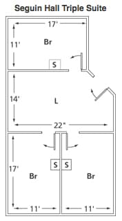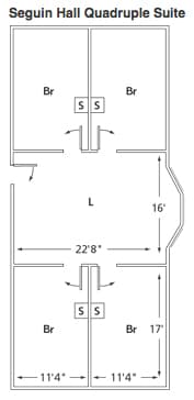 Seguin Hall features both community bathrooms and suite-style bedrooms.