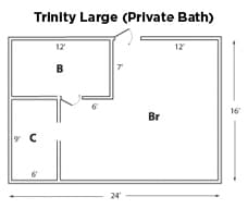 Trinity Hall is one of the south residence halls, which features suite-style and private bathrooms.