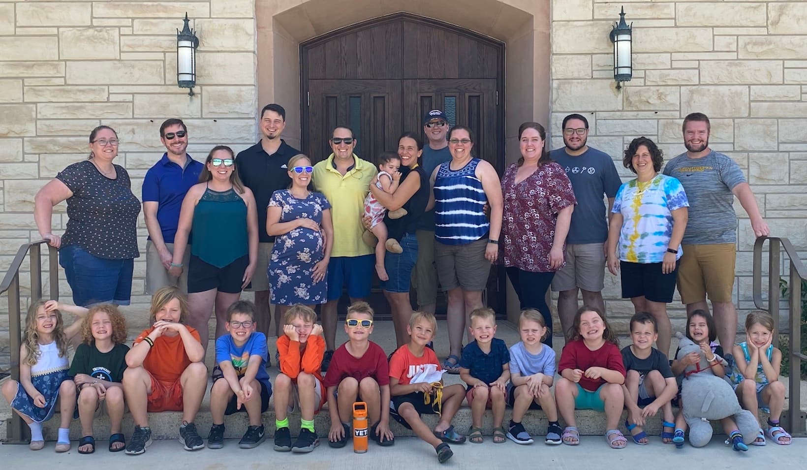 Front row, left to right: Jacey Haug, Micah Haug, James Cain, Jonah Lys, Aldric Fimbel, Joseph Cain, Joel Ullrich, Camden Ehler, Talia Fimbel, Rebekah Cain, Lucas Lys, Lydia Ullrich, Camille Ehler. Back row, left to right: Kelli Roberts Haug (‘10), Tim Vinciguerra (‘10), Kelli Kurachi, Ben Ehler (‘09), Meredith Price Ehler (‘10), Jeremy Ullrich (‘09), Suzanna Ullrich, Amanda Schnelle Ullrich (‘09), Stephen Fimbel (‘12), Mary-Ellen Tolliver Fimbel (‘10), Lauren Haug Lys (‘09), Jonathan Lys (‘09), Jessica Matlack Cain (‘09), Wes Cain (‘09)