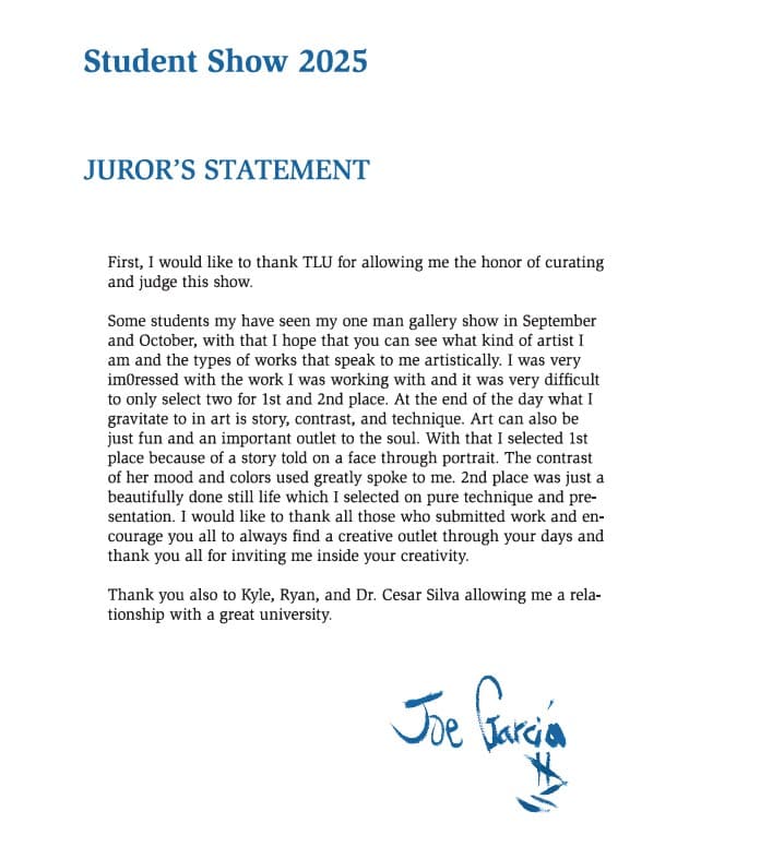 TLU is proud to present the 2025 Juried Student Art Exhibit and opening reception from 3- 5 p.m. Awards will be presented at 4 p.m. Please join us in support of these outstanding student artists. If you are not able to attend the reception, you are welcome to view the exhibit which runs until May 10, 2025.