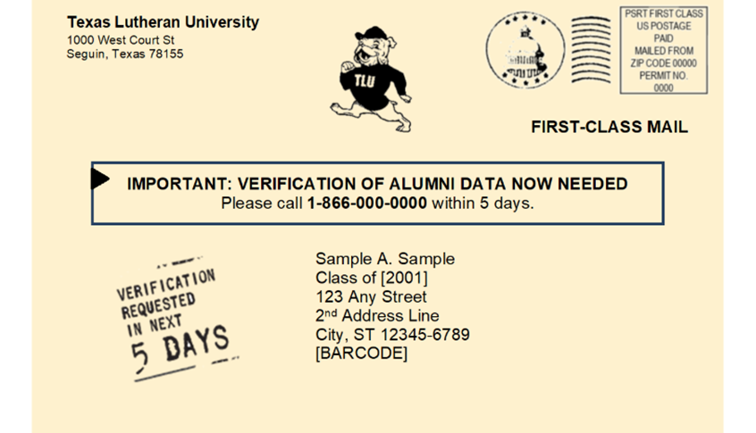 As part of this project, you may receive a postcard (like the example shown below) or an email inviting you to share your Texas Lutheran story. These stories will highlight TLU's impact on the lives of our alumni and celebrate the experiences that have shaped our community. When you contact PCI, you will have the opportunity to share your memories and ensure that your contact information is up to date.