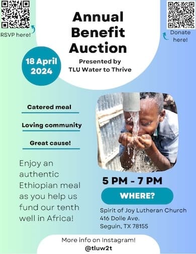 On April 18, the Water to Thrive Student Club will be joining with the TLU Center for Servant Leadership to host its 14th Annual Benefit Dinner and Silent Auction with the goal of raising the $5,000 needed to create another water well. The event will celebrate Ethiopian culture with traditional food and a presentation, as well as a silent auction featuring items donated by local businesses. It will be held at Spirit of Joy Lutheran Church, located at 416 Dolle Avenue in Seguin, on April 18 from 5 to 7 p.m. Tickets can be purchased for $20 each at the door. For those who cannot attend but would like to support Water to Thrive’s efforts, or who would like more information, contact Sophie Salgado at smsalgado@tlu.edu.