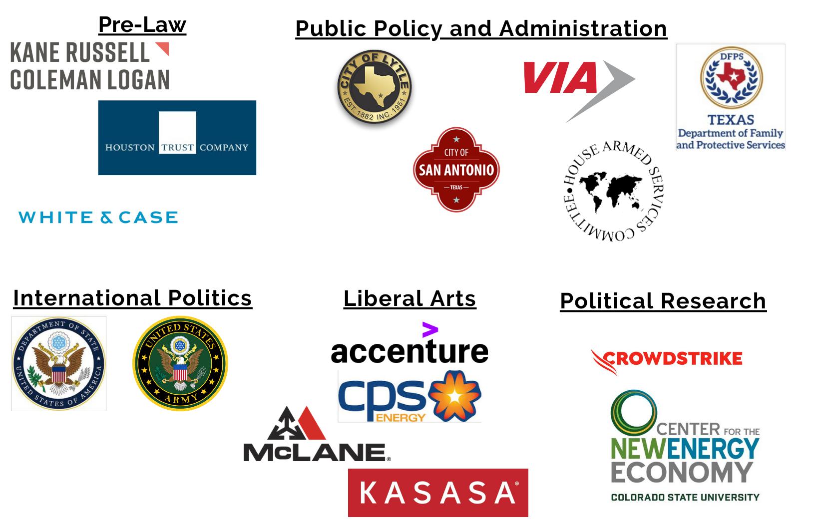 Our individualized advising approach helps match students’ career and life goals with their career plans. We place students at some of the highest ranked law schools in the nation, including Georgetown University, Washington University, Emory University, Arizona State University, and the University of Texas Austin. We also help students who want to practice in Texas join local legal networks that help them gain admission and maximize scholarship opportunities at institutions like the University of Houston, Southern Methodist University, Texas Tech University, St. Mary’s University, and others. Our students work in private practice, firms of all sizes, and at the national level as Chief Legal Officers, Judge Advocates General (JAG), and state attorney positions.